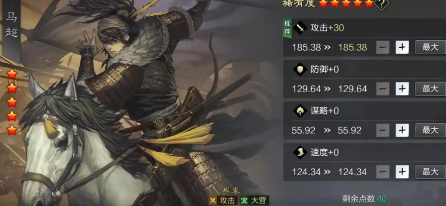 对于马超这个武将,加点其实非常简单直接,核心原则就是要全力堆攻击。因为他的攻击成长高达2.44,在全游戏里都是顶尖的,每一点攻击属性都能转化为实实在伤害,让他的普通攻击、分兵效果和追击战法的伤害变得非常爆炸。你直接把所有可分配的属性点都加到