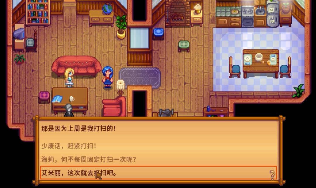 触发海莉的2心事件是提升好感度的关键步骤之一,需要在特定条件下前往海莉与艾米丽共同居住的家中。当玩家进入时,会目睹姐妹两人因家务分配问题发生争执,系统会弹出三个对话选项供玩家选择,每个选项对应不同的好感度变化。正确的选择将直接影响后续剧情发