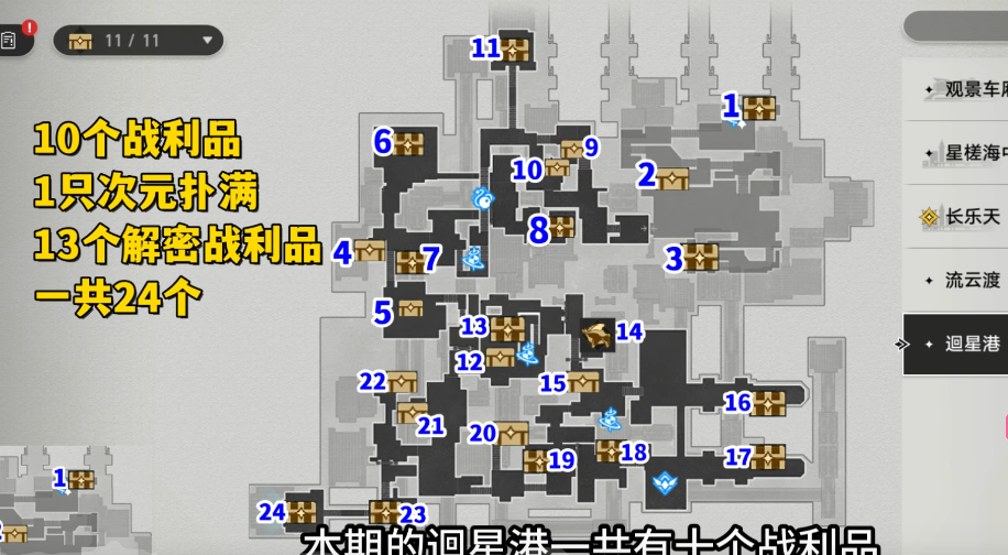 迴星港作为仙舟罗浮的重要区域之一,共分布有22个可收集的宝箱,包含普通宝箱、贵重宝箱以及需要解谜或战斗才能开启的特殊宝箱。这些宝箱的位置较为分散,部分隐藏于角落或需要完成机关互动才能获取,建议按照区域划分系统性地探索。迴星港的宝箱主要集中在