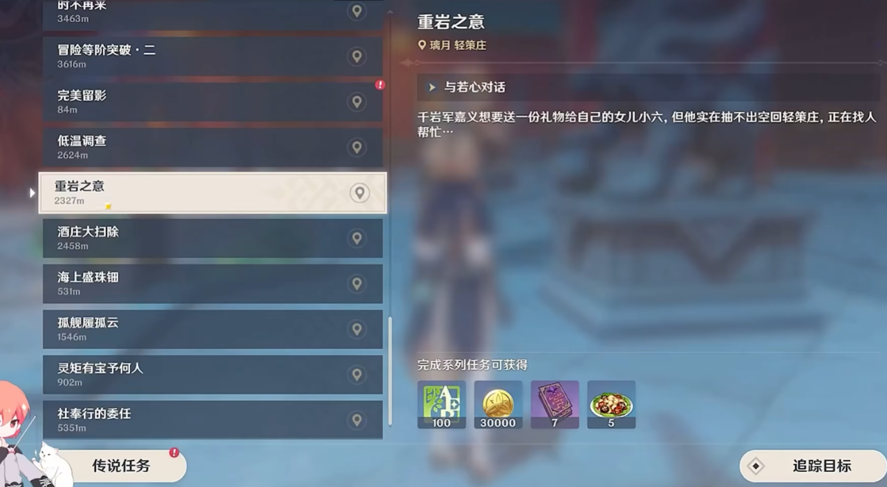 重岩之意任务需要从璃月港的嘉义那里接取,这位千岩军军人因为执勤无法回家,想拜托咱们帮忙给女儿小六送礼物。任务触发点在璃月港总务司门口附近,沿着主路走就能看到嘉义。接任务后需要先传送到轻策庄找若心奶奶打听小六的下落,她会告诉咱们小六跑出去玩了