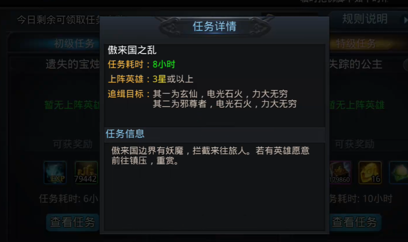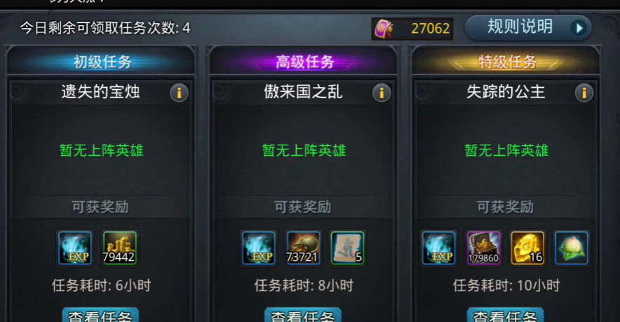 初级任务耗时6小时,高级8小时,特级10小时,每日最多完成4次任务且不可取消。建议优先完成高级和特级任务以获取更高收益。任务奖励分为基础奖励和额外奖励,达成条件越多激活的奖励层级越高,包含通灵之魂、装备强化材料等实用道具。任务期间英雄仍可参与其他玩法,但同一英雄不可同时执行多个追缉任务。