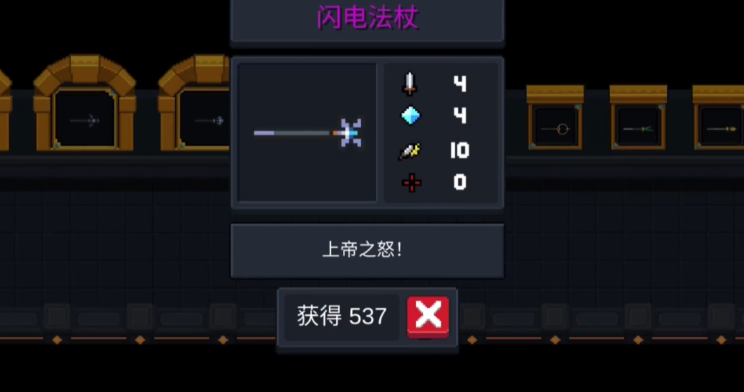 闪电法杖的基础属性为4点攻击力、3点能量消耗、10%暴击率和0点子弹偏移,其攻击方式为向周围环形发射12颗具备穿透和反弹特性的子弹。与自然法杖相比,闪电法杖的子弹增加了穿透和反弹效果,在狭小空间或怪物密集区域能发挥极强清场能力。该武器的攻击范围呈360度无死角覆盖,但需注意在开阔场地可能因子弹分散导致命中率下降。