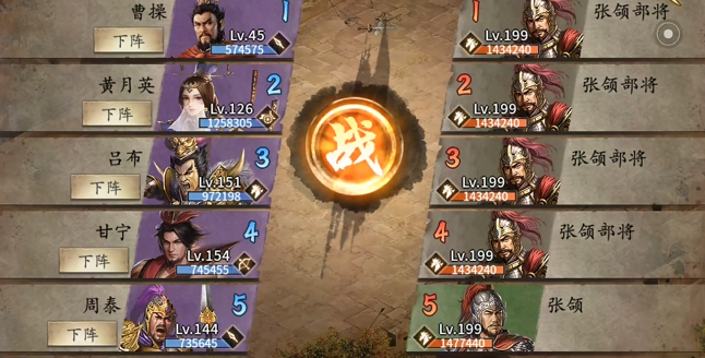 战斗策略上,貂蝉首回合勾引敌人后,剩余武将需集中火力快速清理被勾引的敌人。甘宁的战法应优先释放,破除敌方被动技能。夏侯惇和曹操的平砍输出需配合地形优势,避免被敌方格挡反制。黄月英作为最后一道防线,需在曹操的保护下持续输出。若敌方剩余兵力较多,可调整战术,利用战车或阵法弥补装备不足。