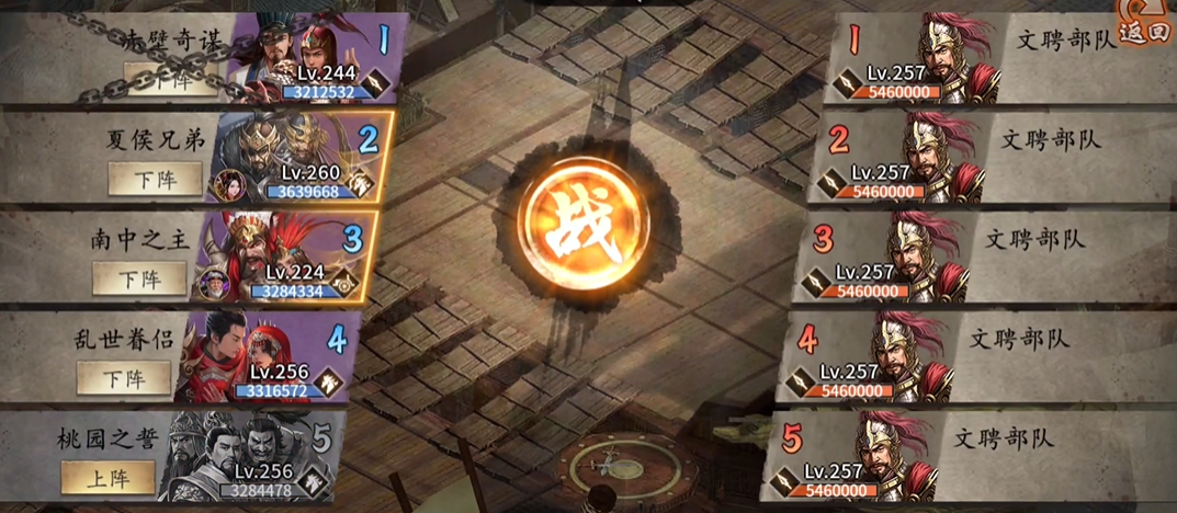 二车选择八卦阵65级,主将用孙策或未觉醒曹操搭配夏侯惇,能混乱剩余敌人。孙策和夏侯惇上场后优先用攻击战术混乱剩余敌人,再用防御战术叠加格挡效果。三车周泰是收尾关键,搭配觉醒孙尚香的助阵效果能提供强力护盾和伤害减免,这套组合能轻松应对剩余敌人,尤其是周泰的固若金汤和步兵克制效果可以稳稳拿下最后四排半敌人。文聘副本的敌人具有高防御和反伤机制,不要盲目硬拼,尽量先解决较弱的敌人减少战斗损失。