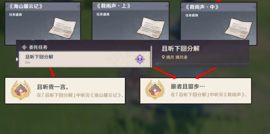 且听我一言同样是且听下回分解任务的一部分,但这次需要咱们找江舟和范二爷对话,拿到海山履云记的内容。把内容带回给茶博士刘苏听完故事就能完成。这个任务和旅者且留步是随机刷新的,所以可能需要多刷几次每日委托。完成这三个成就后,岩港往事第一辑就会自动解锁。整个过程可能需要几天时间,毕竟每日委托是随机的。