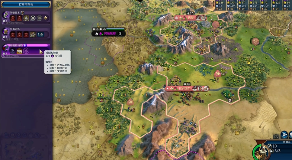 埃莉诺的核心玩法是通过巨作和忠诚度机制实现和平扩张。她的特殊能力爱之法庭让每个巨作能降低9格范围内外国城市每回合1点忠诚度,当城市因忠诚度归零脱离原文明时,若你对它的忠诚压力最高,会直接归入你的版图。这意味着你不需要发动战争就能吞并邻国城市,尤其适合喜欢文化胜利或和平扩张的玩家。开局优先发展剧院广场,尽早获取大作家和大艺术家的巨作,同时注意城市布局,让巨作覆盖更多敌方城市。