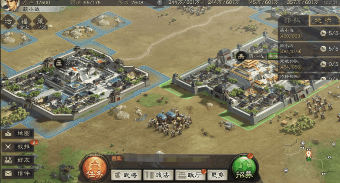分城合作的关键在于选址和同盟协作,首先需要确保名声达到6000同时占领H型11块连地且中心地块为6级以上。分城建造消耗各资源10万,耗时5小时,建成后与主城资源互通但其他功能独立。选址优先考虑同盟聚集区或资源丰富地带,这样能快速获得支援并提升资源产出效率。分城军事建筑升级后能提供额外部队编制,对后期战略布局至关重要。