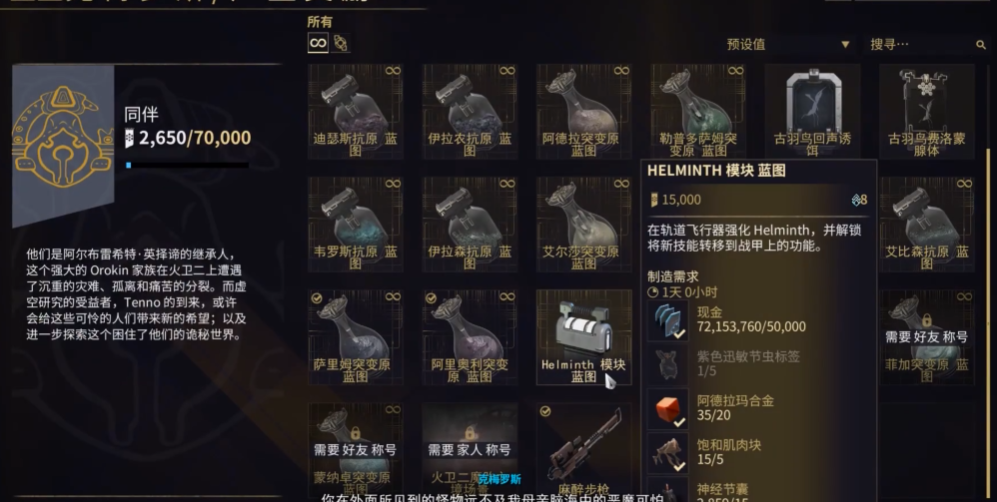 Helminth系统的资源管理需要特别注意。大嘴拥有食欲设定,重复喂食相同资源会导致效率递减,最终可能完全拒绝吸收。建议优先投喂过剩的基础资源,如合金板、回收金属等。当大嘴达到8级后,可接受夜灵平野的Sentient核心等特殊资源,这些资源能重置其对普通材料的食欲。