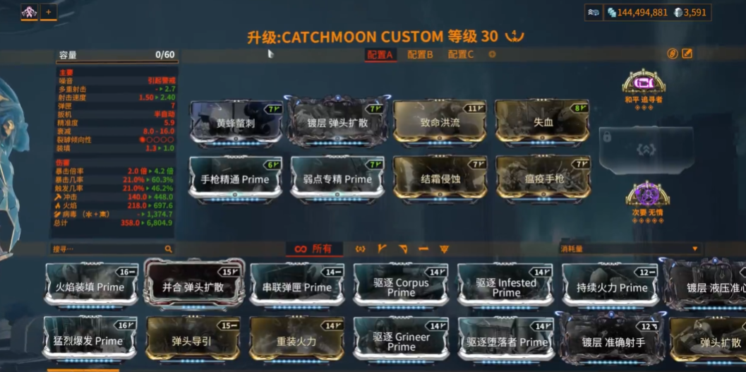 组装时要注意部件搭配,捕月的核心优势在于高爆发伤害,推荐选择增加暴击率和暴击伤害的组件。枪管选响胆能提升射速,握柄用捕月可以优化后坐力。别忘了安装分裂增幅器,这能让子弹分裂成多发弹片,大幅提升清怪效率。组装完成后记得去军械库界面给武器安装催化剂,解锁更多MOD槽位。