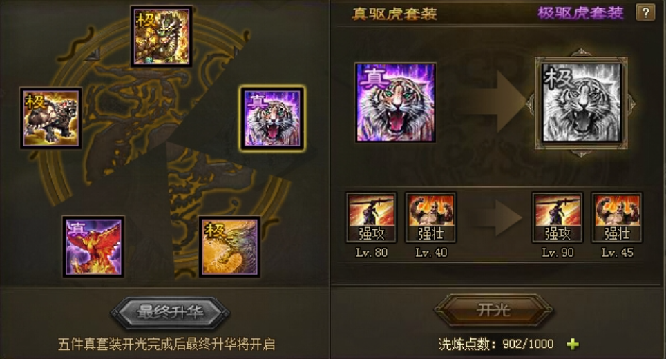 给真套装开光,首先得满足两个硬性条件:等级达到125级且集齐五套真套装(灵龟、霸下、驱虎、烛龙、凤凰)。开光功能会在洗练界面自动解锁,系统还会贴心地弹出动画引导你操作。开光需要消耗洗练点数,每件套装开光固定消耗1000点,这些点数可以通过日常洗练活动、免费至尊洗炼次数或道具折算积累。