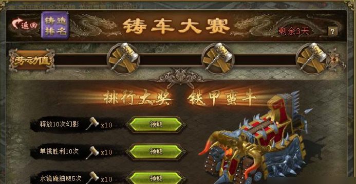 陨铁可通过国战、镇守襄阳等活动稳定积累,战车图纸则依赖远征胜利、矿区争夺等特定玩法。建议每日完成铸车大赛等限时活动获取双倍资源奖励。重铸过程中使用孔明锁可免除陨铁消耗,而七星灯、凤雏环等道具能加速进度,合理利用这些辅助手段可大幅提升升级效率。