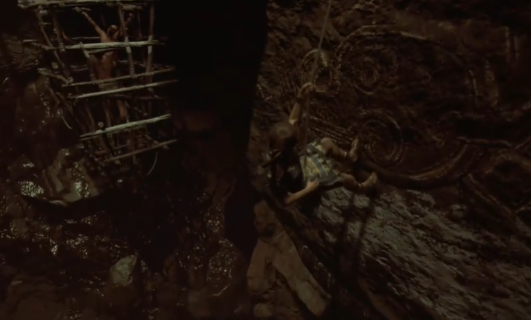 跳跃操作是通关的关键。首先需要从高处索降至最高层平台,随后从右侧尸坑爬入解剖室,凿开右侧石墙进入下一区域。这一区域是丢弃尸体的深坑,地形复杂,需注意观察可攀爬的岩壁和横杆。沿着前方横杆跳上岩壁后,右移攀上岩缝,在木杆端头利用前方横梁攀上岩壁。