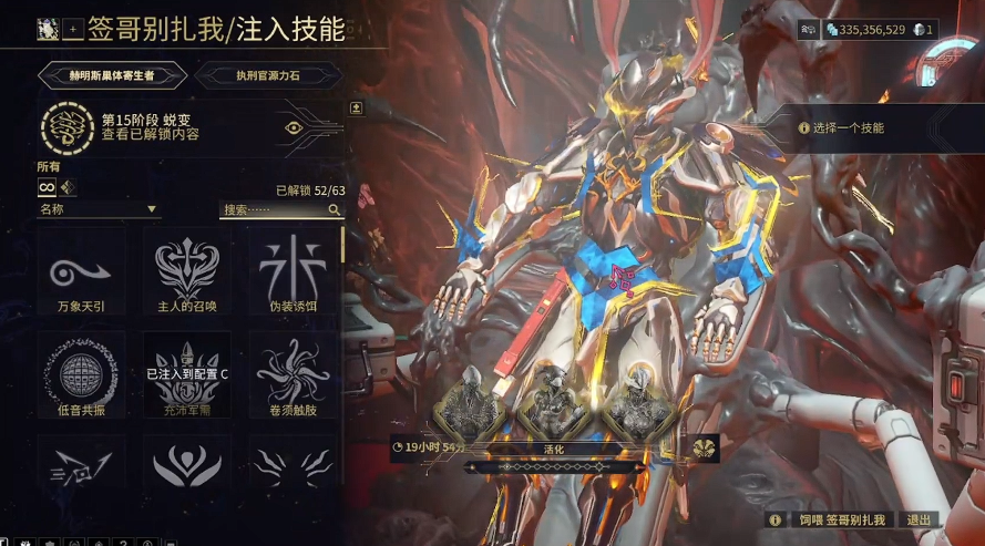 赫明斯巢体的升级依赖蜕变经验,通过吸取战甲积累经验值,随着等级提升会解锁额外槽位和独有技能。饲喂巢体生成的消化液可用于自定义技能,而注入功能允许玩家将赫明斯巢体的技能或其它战甲技能移植到指定战甲上。