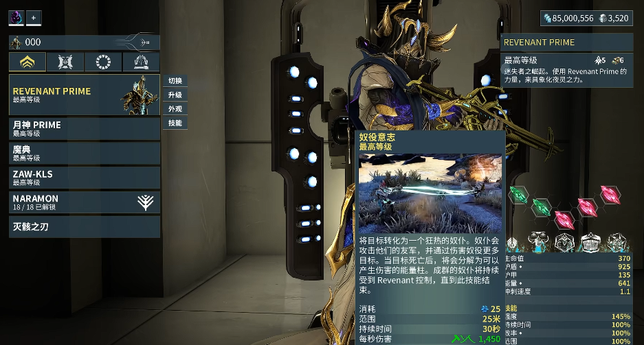 夜灵甲的被动技能心智反击使其在面对Sentient单位时具有优势,尤其是免疫部分夜灵BOSS的攻击。技能奴役意志可将敌人转化为奴仆,持续时间内为玩家作战;催眠外表则能反射伤害并击晕攻击者,大幅提升生存能力。精华掠夺技能允许夜灵甲化为能量洪流,穿透敌人并恢复自身护盾和生命值,而终极技能死亡之舞通过旋转发射能量束,对范围内敌人造成持续伤害。