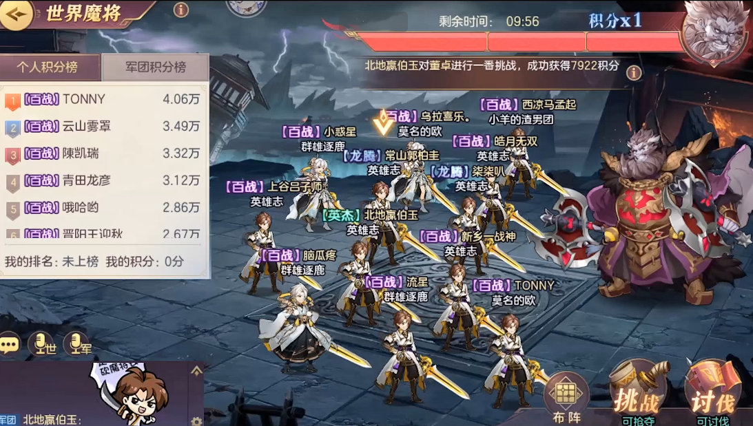 世界魔将作为每晚八点限时开启的团队挑战活动,建议在倒计时8分50秒、5分50秒、3分钟至2分50秒以及最后20秒分别出刀,每次攻击后立刻抢人,因为周围玩家的积分会根据你的实时排名计算,先提升排名能抢到更多分数。积分可在军团拍卖行兑换稀有资源,所以每一刀的时间点都不能错过。