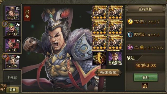 紫吕布作为攻城掠地中的顶级武将,其技能组合以高爆发和群体伤害为核心。战法猛将无双能对敌方全体造成显著伤害,在群战中表现尤为突出。该技能释放时呈现大范围攻击特效,配合骑兵兵种的高机动性,可快速切入敌方阵型。紫吕布的基础属性中统御和勇武数值较高,这使其在攻防两端都有不错表现。觉醒后的紫吕布会获得额外属性加成和技能强化,进一步提升战场统治力。
