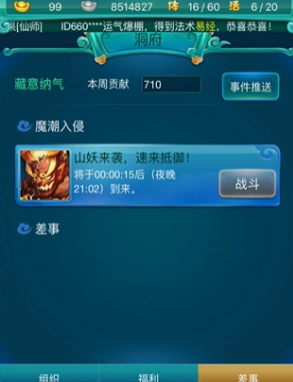 玩法策略上,建议玩家充分利用免费复活次数,集中火力削减关键目标。对于低战力成员,可专注人界门战斗以最大化加成收益;高战力玩家则应主攻天界门或承担BOSS战主力。每周维护结算时,洞府灵气会按贡献比例分配,进一步强化了长期参与的收益。魔潮入侵不仅考验个人战力,更依赖洞府整体的协调能力,是获取五星装备、法术碎片的重要途径。洞府成员需密切关注整点触发的入侵事件,合理安排战斗节奏,才能高效收割奖励。随着洞府等级提升,魔潮入侵的开启成本与挑战难度会相应变化。