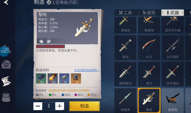 龙鳞剑和红莲都属于那种特效比较酷炫的毕业级别装备,如果你不是特别追求外观和收藏,其实完全可以用黎明剑或者双刃镰先过渡用着,等后面材料非常富裕了再回头来做这两把牌面武器,游戏里武器的强度不仅仅看基础属性,还跟工匠等级和做出来的品质颜色关系很大,比如龙鳞剑如果做出金色品质攻速会有明显提升用起来会舒服很多,红莲的灼烧效果在打高级副本的时候表现也更稳定。