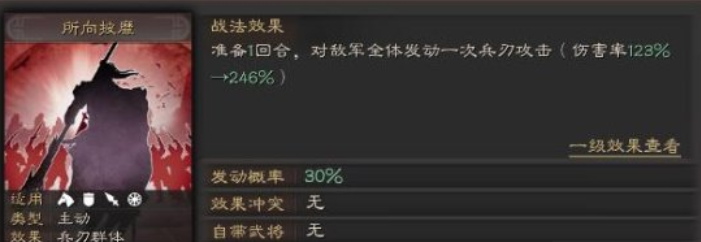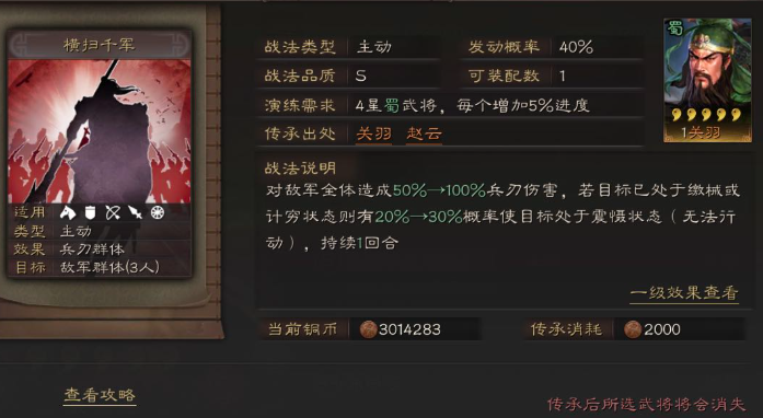 除了纯堆伤害的战法,咱们也可以考虑一些带有控制效果的输出战法,让赵云在打伤害的同时还能搅乱对手的节奏。比如卧薪尝胆这个战法就很有意思,它对敌方群体造成伤害,并且自身存在增益状态时,有概率震慑敌人。赵云自身属性高,很容易获得各种增益,配合起来相得益彰。还有横扫千军,它本身是对全体的兵刃伤害,如果敌人正好处于缴械或计穷状态,还有额外几率触发震慑,和队伍里带了盛气凌敌这类战法的队友配合起来效果极佳。这种搭配思路让赵云不止是一个砍人机器,还能为团队创造控制优势。