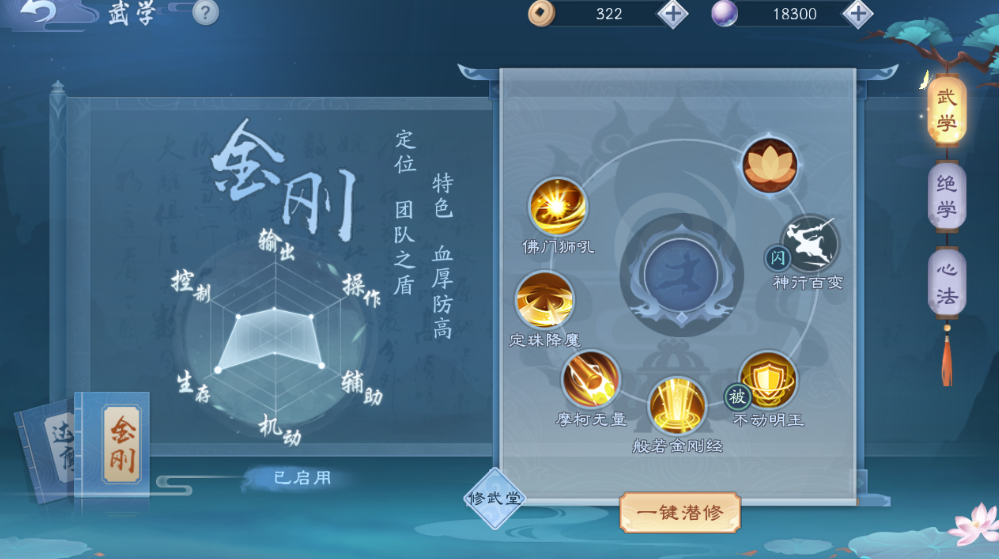 无相在论剑里主要用达摩这个武学流派,另一个金刚流派更偏向于团队抗伤,打单挑比较吃亏。达摩流派的技能连招很有讲究,起手经常会用龙抓手,这个技能冲得快还能晕人,是接近和控制对手的关键,但一开始别急着交,可以先走位逼近骗对方的位移或保命技能。成功控住后可以接韦陀献杵继续打控制,然后跟上百丈伏魔和伏魔棍法打一波伤害,百丈伏魔能给大量战意,是快速攒罡印的好技能。记得在罡印满了之后,普通攻击能减少孤鸿探海的冷却时间,所以技能空档期多穿插普攻。