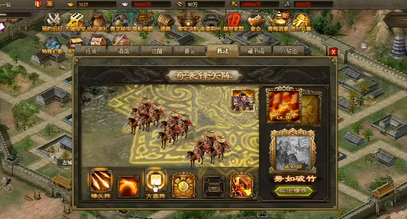 当你费尽千辛万苦把阵法科技点亮之后,第一时间出现在你面前的是三种最基础的阵法选择,它们分别是锋矢阵、雁形阵还有方圆阵。别看这只是基础阵法,它们各自有各自的妙用,能在战斗中给你提供不同的属性加成。不过有个事情得先告诉你,这三个阵法在初始状态下都不是完全体,每个阵法都只给你开放了三个阵法槽位置,剩下的位置都是锁着的状态。如果你想把某个阵法的全部潜力都发挥出来,把所有槽位都打开,那就得为每个阵法额外支付150金币的费用,三个阵法全开的话总花费就是450金币。对于刚开始接触这个系统、手头金币可能不太宽裕的朋友来说,这笔开销可得好好规划一下,当然游戏里偶尔也会有一些消费送礼或者年终庆典之类的活动,在这些活动期间开启阵法有时候能顺带拿到一些额外的资源奖励,算是个比较划算的时机。