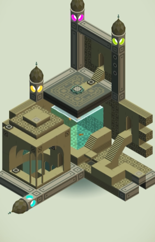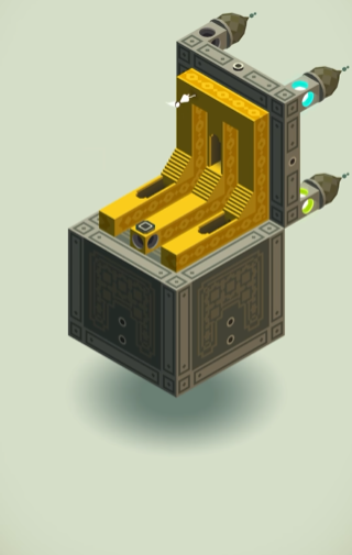 进入关卡后,你会看到一个完全封闭的方正盒子,这就是整个解谜舞台。一开始,点击盒子右上角的凸起按钮,盒子的顶盖会随之打开,主人公艾达便出现在内部空间。操控艾达移动到地面上显眼的黑色圆点机关上并踩下,伴机关触发,盒子一角的第一盏灯塔就会被点亮。完成这一步后,记得让艾达从上方出现的门走出去。