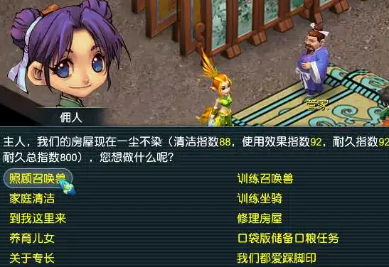 佣人房还有一个非常实在且关键的作用,那就是直接关系到你整个房子的健康状态。你的房子跟现实中的一样,住久了清洁度和耐久度都会下降。这两个数值一低,你在卧室休息时恢复气血、魔法和活力的效果就会大打折扣,连喂养宠物增加寿命的收益也可能变少。这时候,佣人房的价值就体现出来了。你每次花钱请佣人打扫或修理房子时,能恢复多少点清洁度和耐久度,全看你佣人房的等级。等级越高,一次维护恢复的数值就越多。这意味着你的房子能更长时间保持最佳状态,维护周期被拉长了,从长远看,你花在修房子上的钱也就更值当了,是一种很聪明的省钱省心之道。