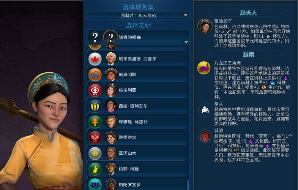 越南文明是一个特色鲜明、玩法独特的阵营,其胜利路线的选择高度依赖于其文明与领袖的特殊能力。领袖赵夫人的能力驱除吴军为核心,使得所有作战单位在雨林、树林或沼泽单元格中能获得显著的战斗力与移动力提升,若该单元格属于越南领土,加成效果还会翻倍。这使得越南在防守端拥有近乎无敌的优势,尤其适合前期采取稳健的防守策略来积累优势,为后续的胜利奠定坚实基础。