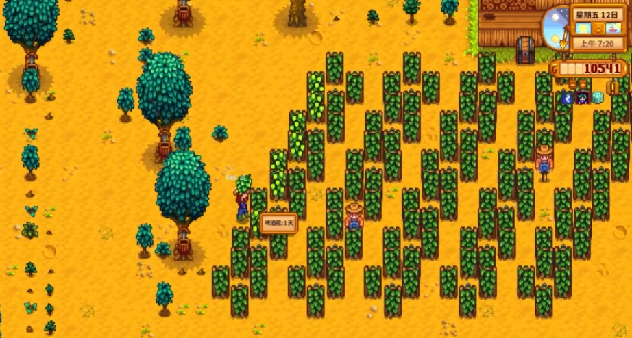 酿造的过程很简单,把你收获的水果、蔬菜或者其他特定作物直接放进小桶里就行,然后等待一段时间发酵完成。不同的原料酿造的时长和产出的酒价值都不一样。啤酒花酿淡啤酒只需要1到2天,但啤酒花需要每天采收,管理起来比较费事。水果类像蓝莓、草莓酿果酒一般需要大约7天,虽然周期长但管理轻松。前期用啤酒花或蓝莓性价比高,能快速回本。到了中后期,你的目标应该转向价值最高的作物,比如在沙漠商店能买到的杨桃种子种出的杨桃,或者通过捐赠上古种子给博物馆获得、能用种子生产器无限复制的上古水果。把它们酿成酒,收益会非常惊人。
