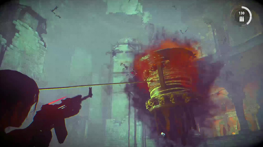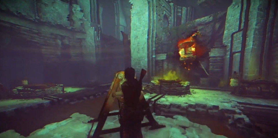 战斗的具体流程围绕着几个固定的矿井装置展开,玩家的核心攻击手段是使用绳箭。当劳拉来到特定遗迹场景时,战斗便会触发。你需要先用绳箭连接女巫,然后将其拉拽向场景中分布的可点燃矿井,当女巫被拉至矿井喷发的火焰上方时,便会受到大量伤害。这个过程需要重复数次,对应不同的战斗阶段。在整个过程中,玩家必须密切关注躲避女巫投掷的火球攻击,看到其抬手动作时就需及时闪避,因为这是其主要伤害技能。尤其在战斗后期,女巫被拉拽时会试图起身割断绳索,因此必须在她切断连接前完成点燃矿井的操作。