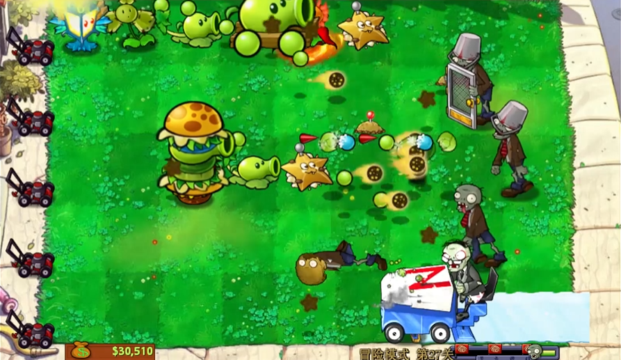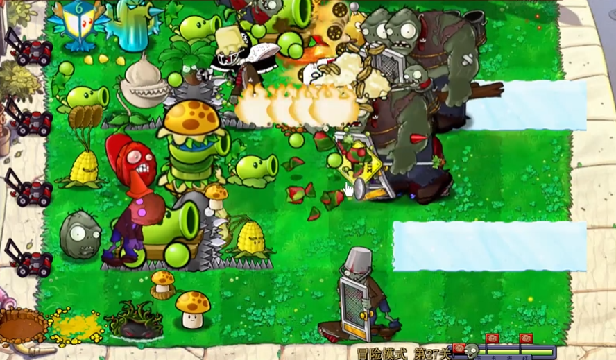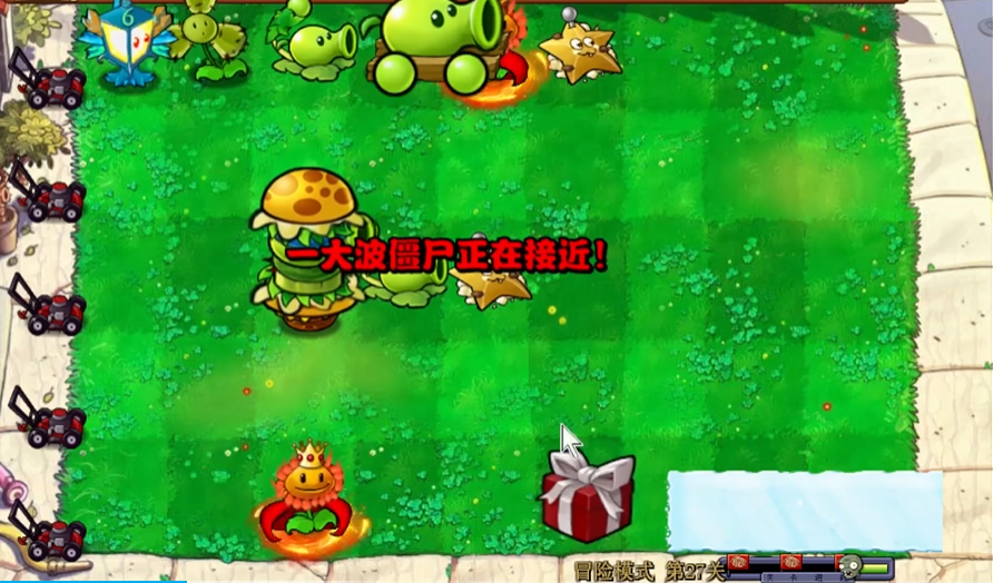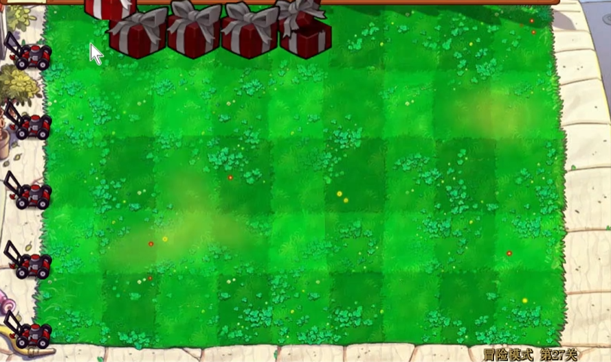 第27关的核心在于灵活应对六路僵尸的无限进攻,并克服盲盒随机机制对植物布局的限制。开局必须优先在场地左侧第二列种植一整排盲盒,以建立最初的防线,并准备好铲子,以便及时移除开出的、暂时不需要的防御类植物,为后续摆放强力输出植物腾出空间。