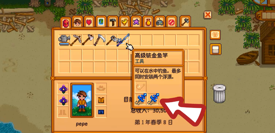 星露谷物语优质浮标只能安装在铱金鱼竿与高级铱金鱼竿上,安装时打开背包,左键选中优质浮标后右键点击铱金鱼竿即可完成装配,卸下则需先右键鱼竿移除鱼饵,再右键鱼竿取下浮标。优质浮标是提升钓鱼品质的核心钓具,能让钓获的鱼品质直接提升一级,银星鱼可变为金星鱼,金星鱼则能升级为铱星鱼,是批量获取高价值鱼类、完成社区中心收集包与料理制作的关键道具。安装前必须确认鱼竿类型,初始竹竿、玻璃纤维鱼竿均无法装配钓具,只有最高级的铱金鱼竿与高级铱金鱼竿支持,且铱金鱼竿仅能装一个钓具,高级铱金鱼竿可同时装备两个优质浮标,效果叠加后能让鱼品质提升两级,银星鱼可直接变为铱星鱼。