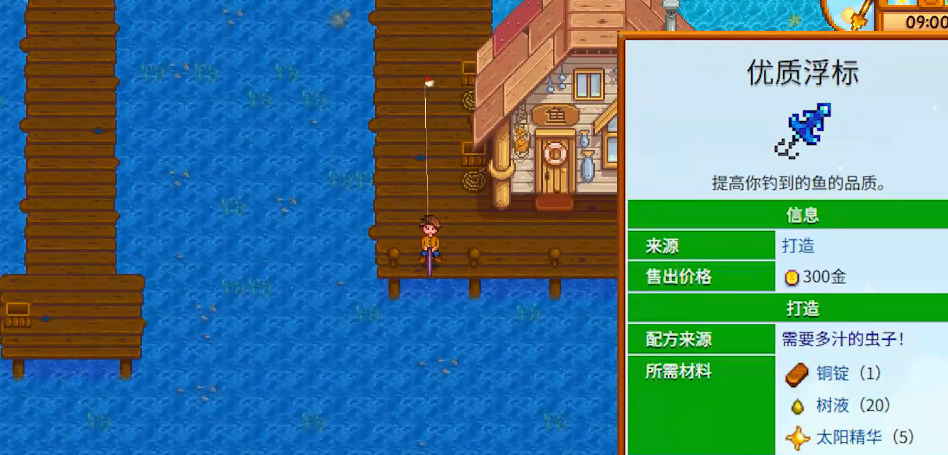 安装优质浮标前需先获取该道具,核心途径是完成威利发布的特别订单“需要多汁的虫子!”,交付任务后触发剧情即可解锁制作配方,也可通过姜岛日记残页#4的提示挖掘获取现成浮标,或在钓鱼等级达标后于威利渔具店购买。制作优质浮标需准备1个铜锭、20份树液与5个太阳精华,铜锭由熔炉熔炼铜矿石获得,树液可通过砍伐普通树木获取,太阳精华则来自矿洞击杀幽灵、飞蛇等怪物的掉落物,集齐材料后在工作台即可制作。优质浮标无法堆叠,每个单独占用背包格子,使用时会显示耐久条,单个浮标可使用20次,仅成功钓起鱼类时消耗耐久,钓到藻类、垃圾等物品不会减少耐久,搭配鱼饵同时装备也不影响效果。
