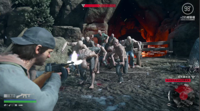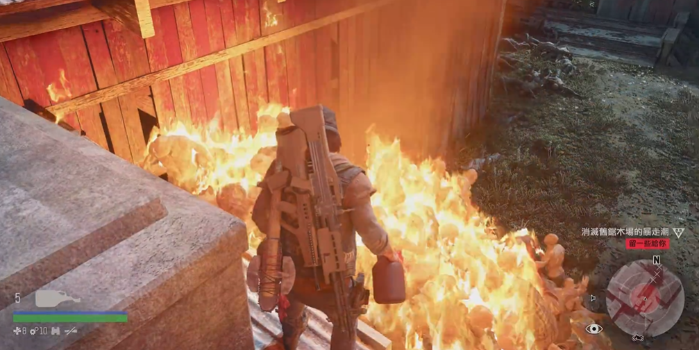 实战阶段的核心战术为机动拉扯与范围杀伤结合,全程保持移动避免原地输出,采用边后退边射击的风筝打法,借助移动中回头观察的技巧掌握尸潮追击节奏,每隔数秒触发该操作监测迅击者等特殊目标的位置。开战初期向尸群中心投掷燃烧瓶制造持续范围伤害,同时精准引爆预先标记的环境爆炸物,瞬间削减尸潮规模,当尸群逼近时立即使用翻滚技能脱离,利用卡车货厢、岩石等掩体短暂休整并完成换弹。尸潮数量削减至半数后会分散为小股部队,此时切换精准射击模式点杀残余目标,被包围时向脚下投掷燃烧瓶制造临时安全区,再借助翻滚或狭窄缝隙突围,全程关注耐力条消耗,避免因耐力耗尽陷入被动。