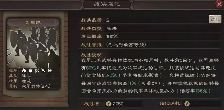 战法选择是克制武锋阵的关键,当锋摧决可直接伪报敌方被动与指挥战法,让武锋阵的减伤与挑拨效果短暂失效,是破解该阵法的核心战法。同时搭配盛气凌敌实现群体缴械,封锁敌方副将普攻与突击战法输出,再配合暂避其锋、御敌屏障提升自身生存,草船借箭、刮骨疗毒保障续航,形成压制与反制闭环。面对携带左慈、程普的武锋体系,额外配备净化类战法,解除敌方控制与减伤buff,进一步压缩其操作空间。