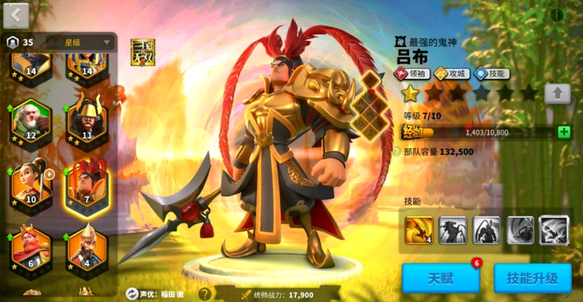 吕布是一位极具特色的骑兵统帅,拥有强大的单体爆发和团队增益能力。他的主动技能方天戟能对扇形范围内最多三个目标造成高额伤害,同时降低敌人防御力,这在团战中能有效削弱敌方前排的坦度。被动技能人中吕布还能提升部队攻击力,配合貂蝉时效果更佳,让骑兵队伍的伤害输出直接提升一个档次。