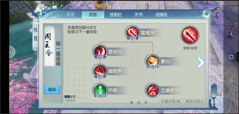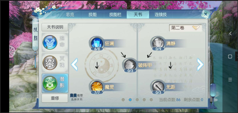 技能加点方面优先保证三个主输出技能满级,被动技能前期可以少点。天书选择主潜影辅灭魂能兼顾生存和爆发,特别适合新手。法宝灌魔优先提升大招和核心输出技能等级。记住绝影是个需要练习手感的职业,多调整几次技能位置找到最适合自己的布局很重要。