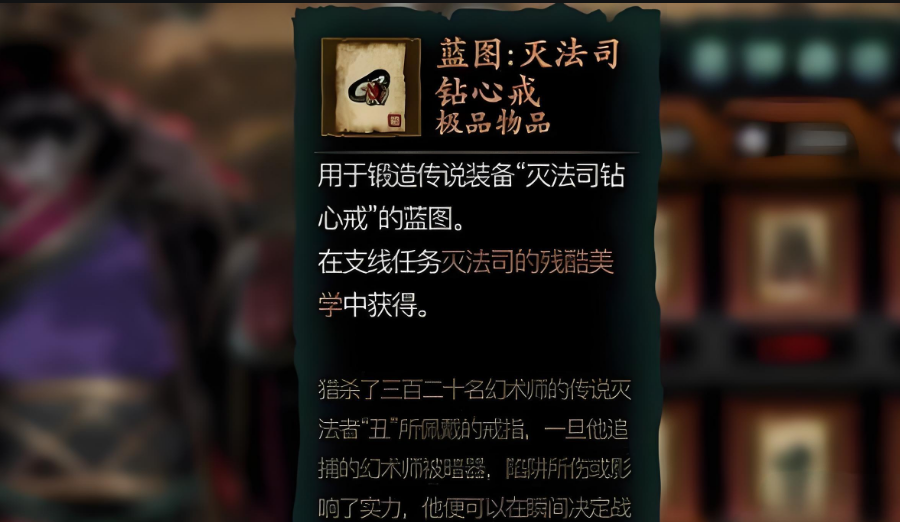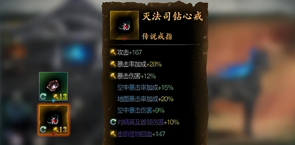 灭法司钻心戒是游戏里非常强力的传说级戒指,全职业通用,基础攻击加成在41-53之间。它的核心特效是当敌人身上带有流血、中毒、燃烧等负面状态时,每次攻击能额外提升10%伤害,这个效果可以叠加。想要拿到它,咱们得先完成一个叫逃犯出没请小心的支线任务,任务链里有个关键环节叫灭法司的残酷美学。