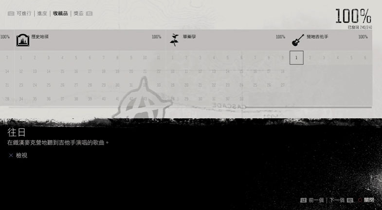 吉他手演奏的6首曲目分别为YesterdayMirrorsOurLiesPerfectShesMyDrugSunWontShine。若右上角提示没有新歌,说明当前触发的是已收集的曲目,需继续等待后续刷新。主线剧情中洛斯特湖区域可能暂时封锁,但通关后仍可返回营地完成收集。