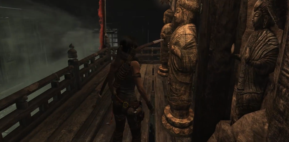 该场景存在两套独立机关系统,风力变化与跳板升降存在严格的时间差。若过早升起跳板会导致风力未达峰值,劳拉无法抵达目标高度;过晚操作则跳板已开始下降。建议通过环境音效判断时机,当听到风声骤然增强且跳板发出机械运转声时,立即执行跳跃动作。攀爬过程中需注意保持最左侧站位,避免被风力偏移轨迹。