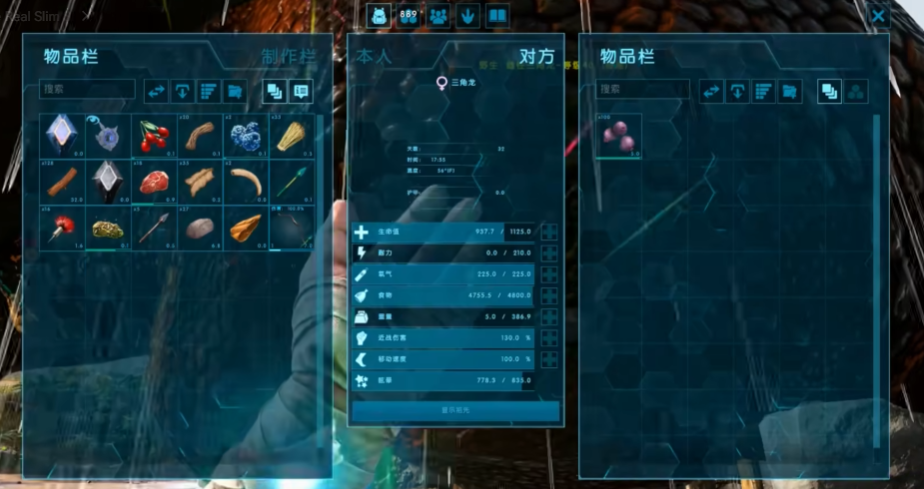 击晕后需立即打开三角龙背包放入食物。紫色浆果是基础选择,但驯服速度较慢;肉牛龙蛋能显著缩短时间。黑色浆果或麻醉药需同步放入以维持眩晕值。驯服过程中需远离其他敌对生物干扰,并确保三角龙不会提前苏醒。驯服进度可通过背包界面查看,满值后即可完成驯服。