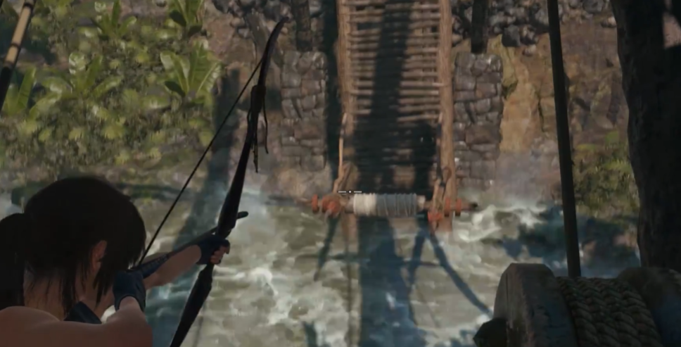 完成水流引导后,立即从石轮右侧跳至下层平台。绿色容器因注水下沉,带动绳桩下降,需用绳索箭矢将两侧绳桩连接。瞄准对岸断桥上的绳圈射击,形成绳索桥即可通行。若操作耗时过长导致容器内水流尽,需重新启动水塔并推动石轮。此环节对时机把握要求较高,建议提前调整视角以快速锁定绳圈位置。