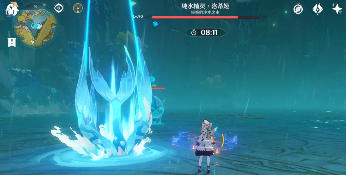 战斗分为三个阶段,每击败两波幻形会进入下一阶段,平台格子逐渐减少至五块。二阶段开始纯水精灵会同时召唤两波幻形,需合理分配角色技能冷却时间。若输出不足导致战斗超时,BOSS会发动秒杀级全屏攻击,因此需保证队伍中有足够爆发能力或持续输出手段。携带治疗角色如芭芭拉或琴可提升容错率。