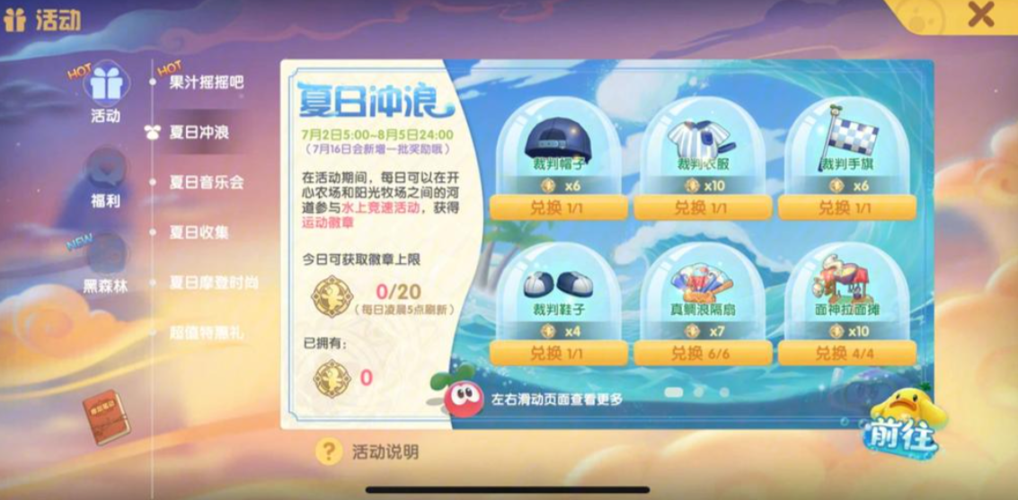 夏日冲浪活动中,玩家需前往牧场水池完成水上竞速任务。活动开启后,系统会自动生成船只供玩家使用,无需提前准备。需竞速需按固定顺序触碰12个浮筒才能记录有效成绩。若想提升效率,可购买6元礼包解锁专属冲浪板,但该道具仅限外观装饰,不影响船只功能。活动期间每日最多可获取20枚运动徽章,用于兑换限定奖励,但船只本身为临时使用道具,活动结束后消失。