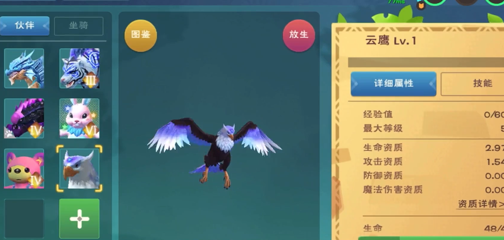 资质属性上,利刃云鹰的各项初始数值均优于普通云鹰,生命资质和攻击资质的上限更高。两者都拥有飞行冲击普攻技能和触发概率约15%的利爪突袭技能,后者能造成约150%伤害。实际战斗中,利爪突袭会紧随普攻快速触发,在短时间内造成更高伤害输出,这种攻击模式使利刃云鹰在PVE和PVP中都有不错的表现。