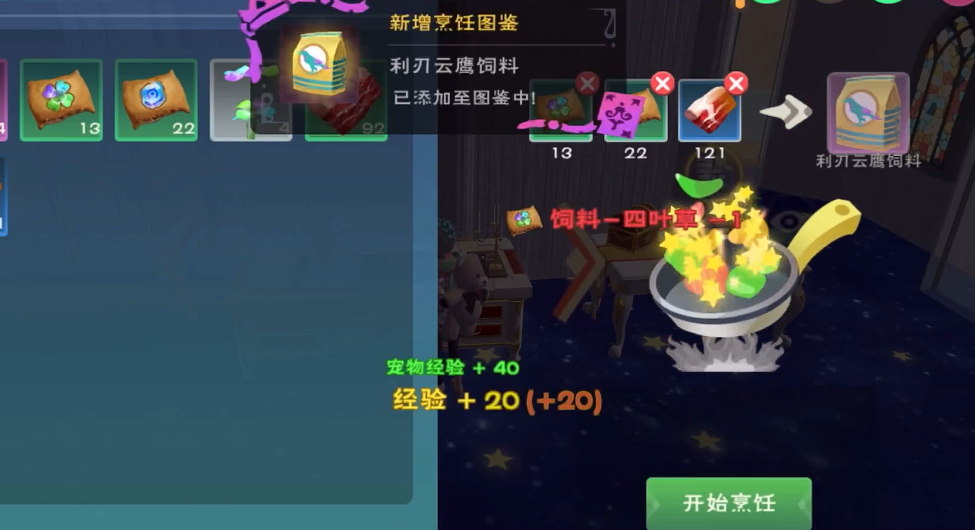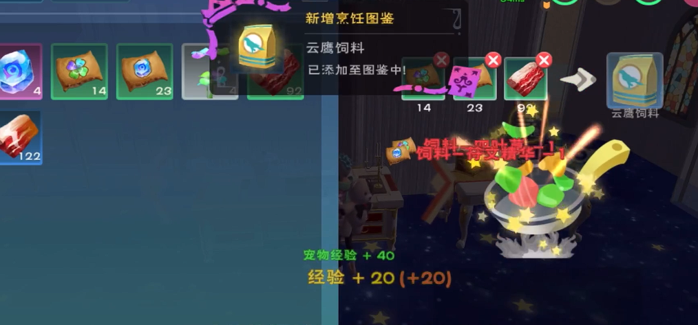 饲料需求方面,云鹰需要13包由优质肉、符文精华包和四叶草包组成的饲料,而利刃云鹰则需要18包采用稀有肉替代优质肉的同类饲料。符文精华包和四叶草包都需要通过工作台将原材料加工合成,其中符文精华通过击杀天空群岛生物获取,四叶草则广泛分布于龙树岛周边。稀有肉的获取难度略高于优质肉,需要击杀暴力兔、岩火剑齿虎等高等级普通怪物。