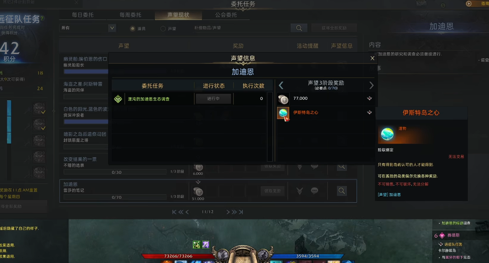 获取伊斯特尔岛的岛之心需要完成紫色任务线并解锁每日委托任务。声望系统分为三个阶段,每个阶段需要7天时间完成相应任务。具体任务是混沌的加迪恩生态调查,要求玩家调查地上的光点直至进度达到100%,然后向蕾莎提交任务。连续完成21天后,当加迪恩声望达到3阶段时,即可获得伊斯特尔岛之心作为奖励。