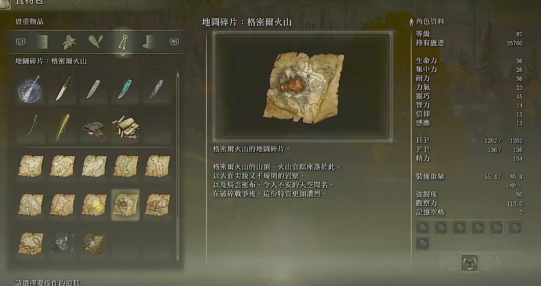 火山地图碎片位于格密尔火山区域的移送罪人之路赐福点附近。从罪人桥出发,沿山壁前进可发现一处隐蔽的绳梯,攀爬后继续沿路径探索,最终会在路边石碑旁找到地图碎片。该区域地形复杂,建议提前装备抗火护符或火焰抗性装备以应对环境伤害。若从火山官邸正门进入,需注意走廊右侧第一个房间为隐藏门,攻击墙面即可进入火山内城。