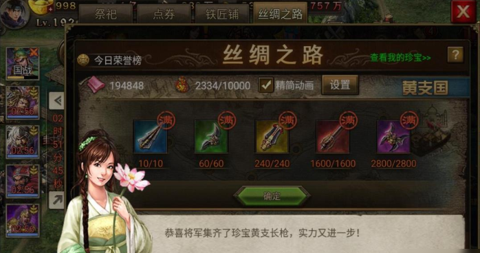 遇到商人事件时,若资源充足可优先购买锦囊;答题事件需根据当前珍宝进度选择最优解,通常选择增加碎片数量的选项。跑丝绸路线建议优先平原区域,避免山地等低效地形。每次跑完1800次内陆路线后,需补足600个第一部件以确保进度连贯性。活动期间可通过海岛寻宝或大宴群雄额外获取丝绸资源。