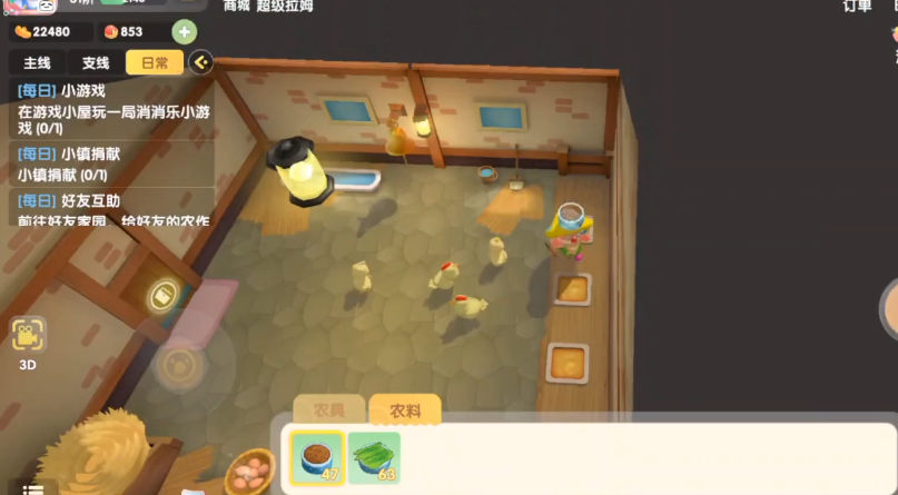 给鸡喂食需要先将鸡召回禽舍内,因为鸡在室外是无法进食的。具体操作方法是摇动禽舍内的铃铛,鸡听到后会回到禽舍,将饲料放入饲料盆即可。饲料需要前往阳光牧场的尤尤商店购买,购买后直接放置在禽舍的饲料盆中,鸡会自动进食。需禽舍内外各有一个铃铛,只有摇动禽舍内部的铃铛才能召回鸡群。
